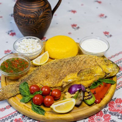 Platou cu pește prăjit cu mămăligă brânză, smântînă și mujdei