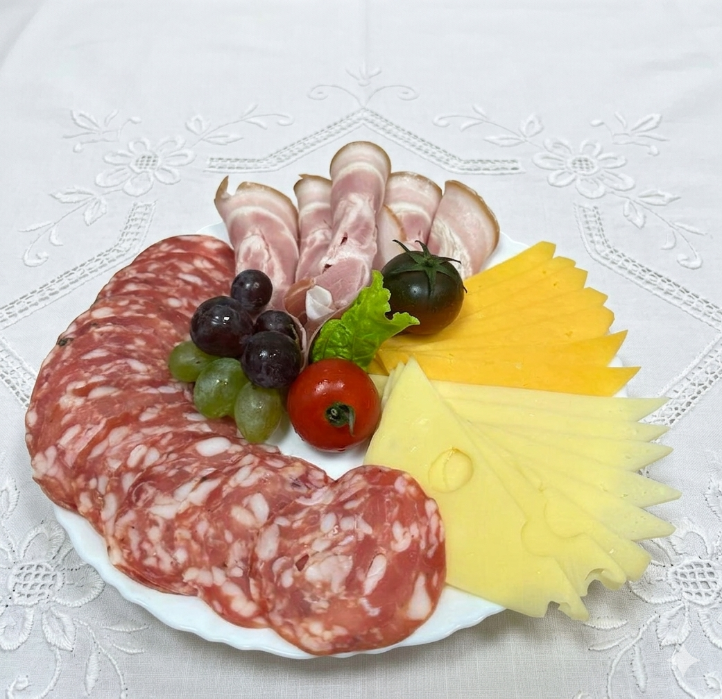 Platou clasic și savuros, ideal pentru gustări sau mese festive, ce combină selecții variate de cașcavaluri fine și salamuri aromate. O alegere echilibrată, cu gusturi bogate și texturi diverse, perfectă pentru a fi împărțită.
