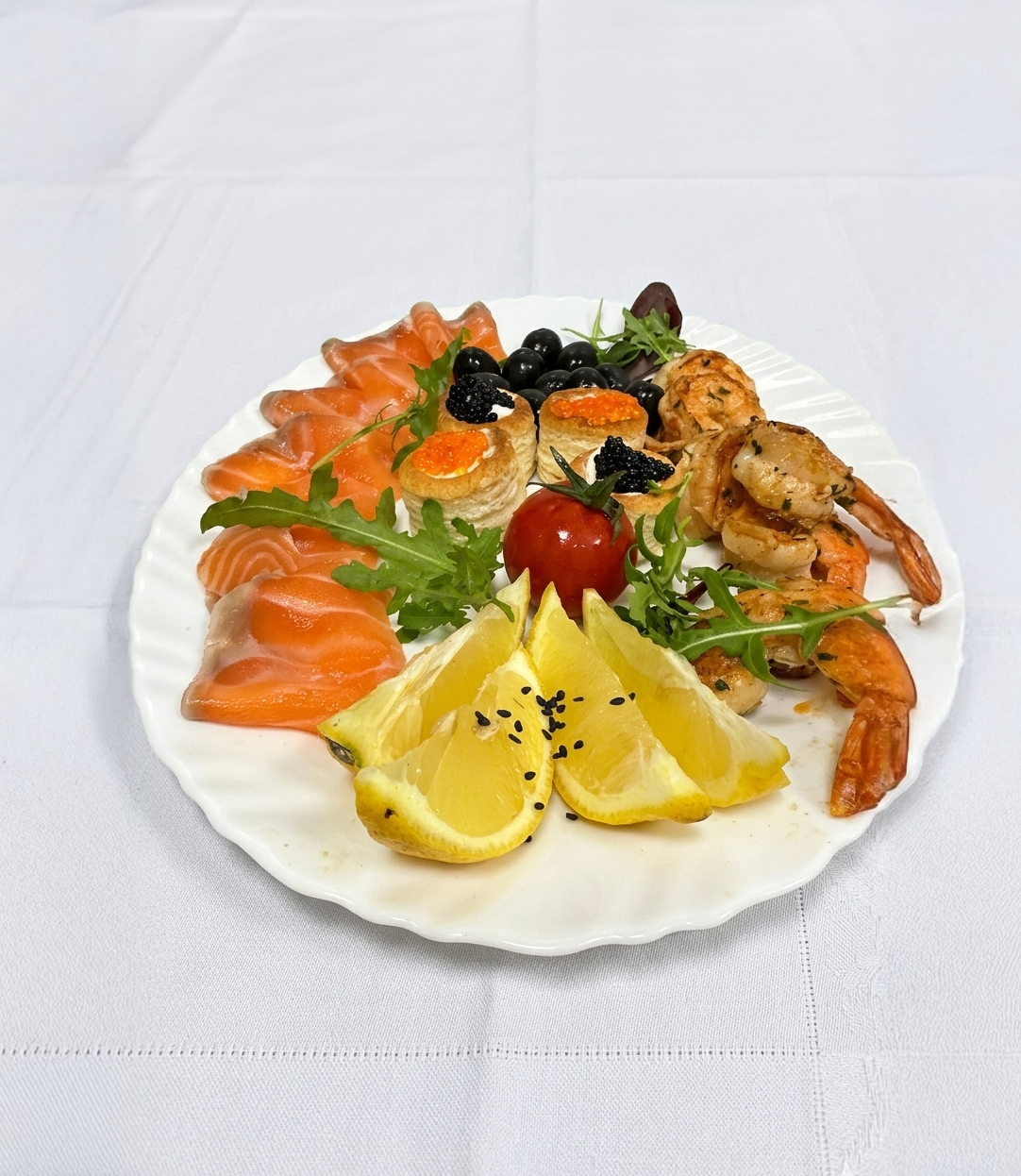 Platou rafinat cu selecție de pește și fructe de mare, perfect echilibrat între prospețime și finețe. Somonul delicat și creveții suculenți sunt completați de coșulețe crocante cu cremă de brânză și caviar, alături de măsline și lămâie pentru un plus de savoare și prospețime.