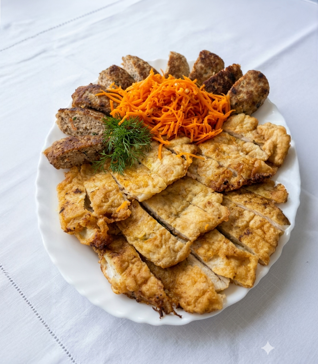 Platou gustos din bucătăria tradițională, ce îmbină preparate din carne fragedă și suculentă, gătite în stil de casă, cu o salată crocantă și aromată de morcov corean. Un echilibru între texturi și arome – de la crocant și rumen, la proaspăt și ușor picant.