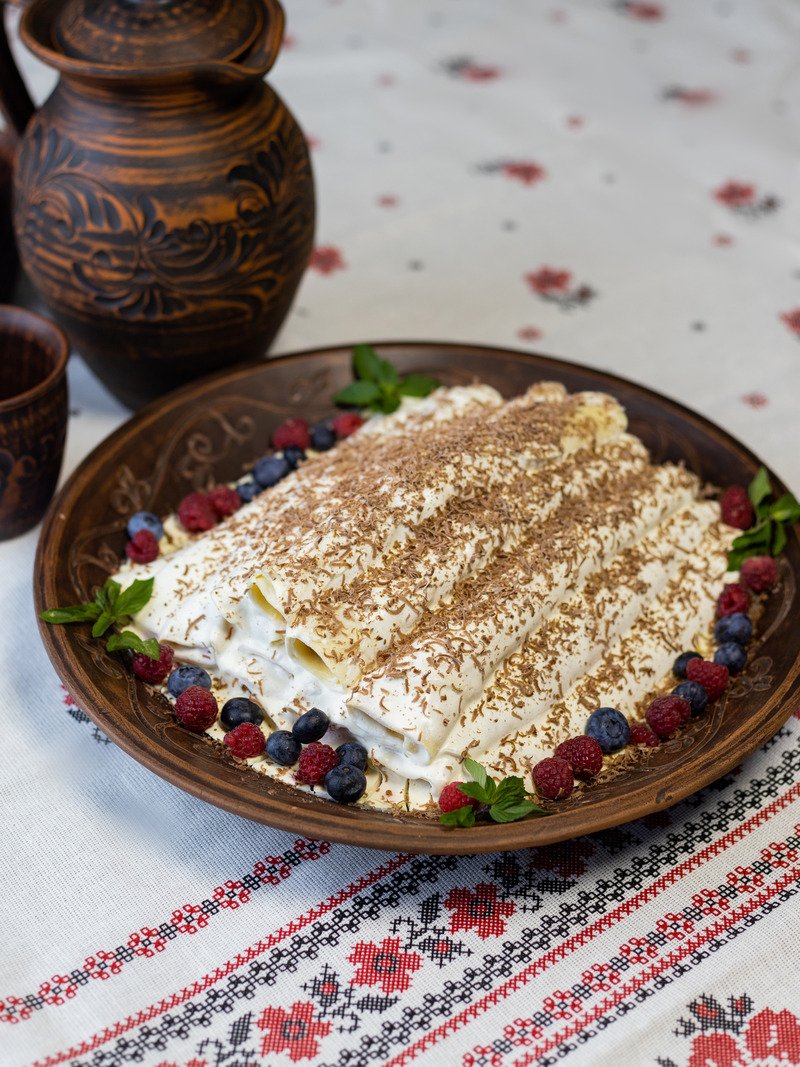 Vlătite fine rulate cu vișine, aranjate în formă de „cușmă” și acoperite cu un strat generos de smântână dulce și ciocolată rasă. Fraged, răcoritor și aromat, cu gust echilibrat între dulce și acrișor.